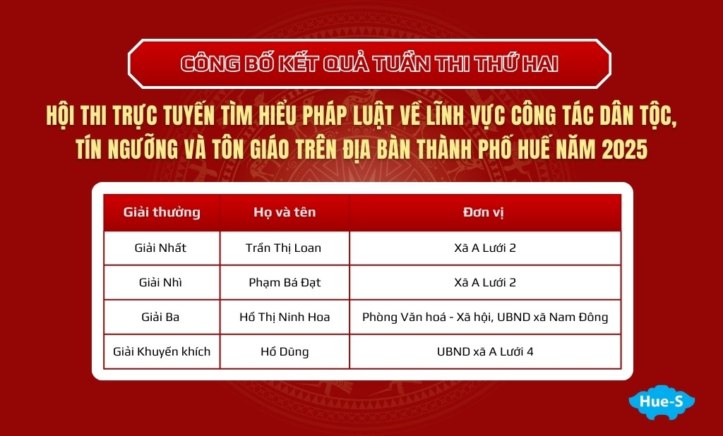 Công bố kết quả Tuần thi thứ hai Hội thi trực tuyến tìm hiểu pháp luật về lĩnh vực công tác dân tộc, tín ngưỡng và tôn giáo trên địa bàn thành phố Huế năm 2025